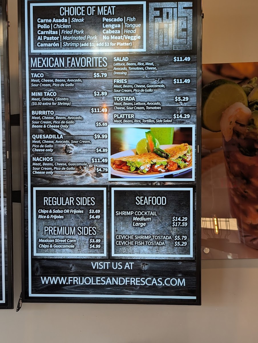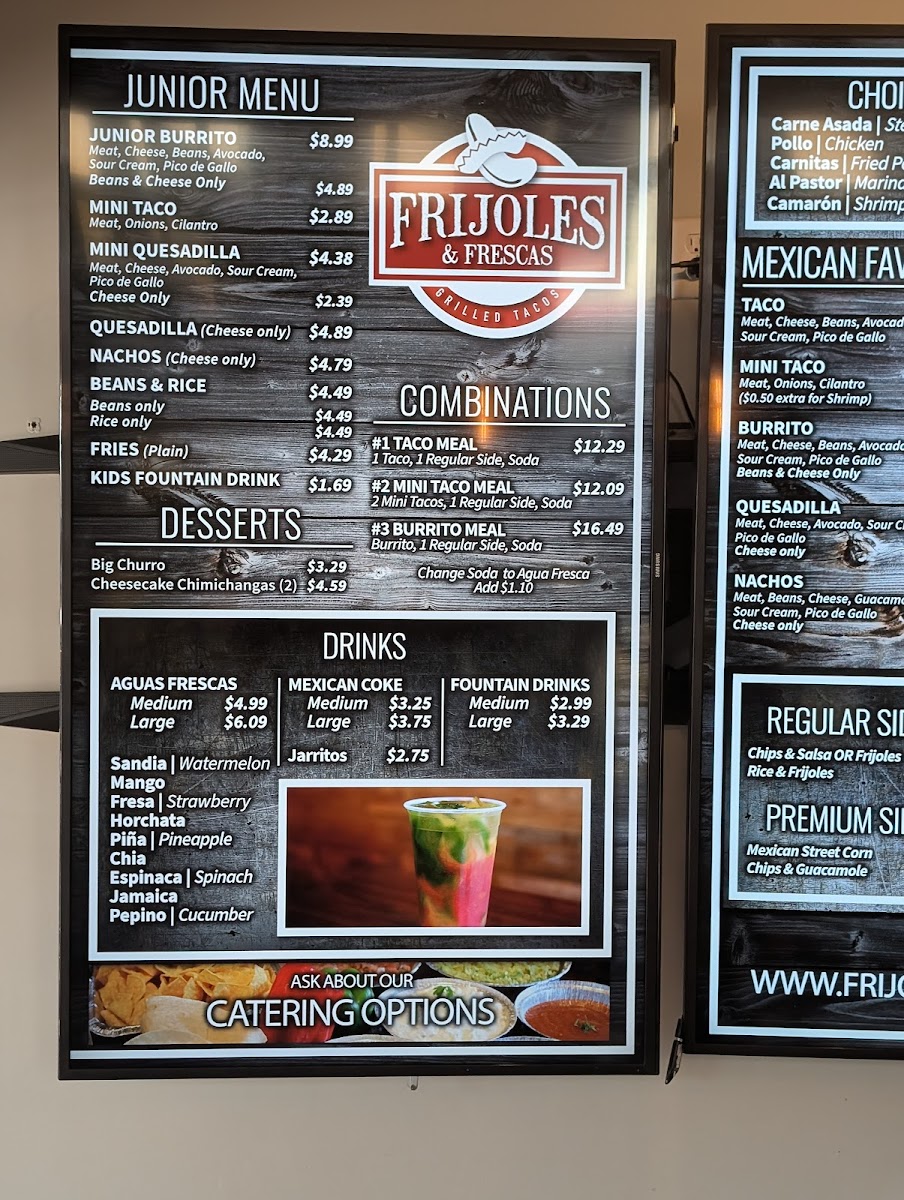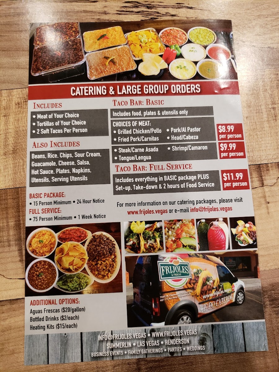The menu at Frijoles & Frescas Grilled Tacos presents a variety of Mexican dishes and beverages suitable for casual dining or catering needs. It includes a range of tacos, burritos, and traditional Mexican appetizers and sides, accommodating both meat and vegetarian preferences.