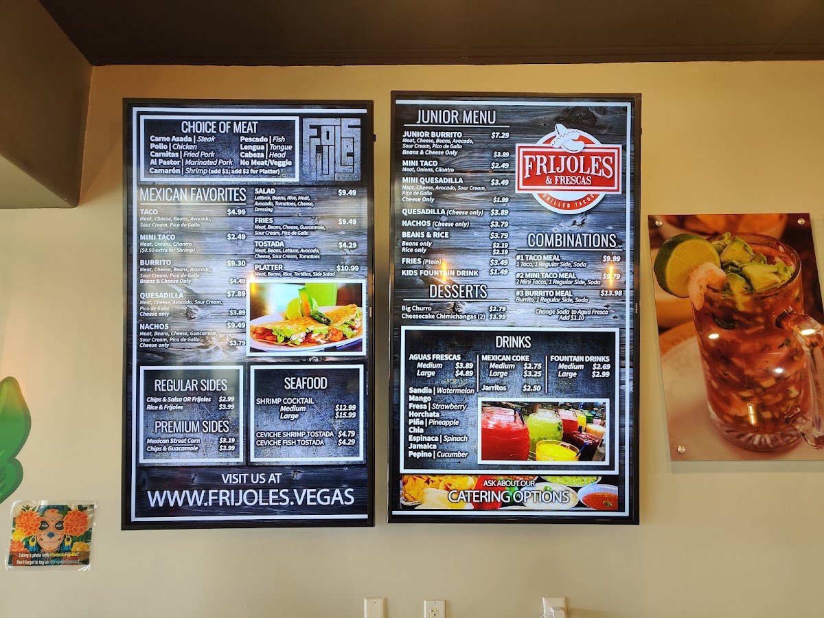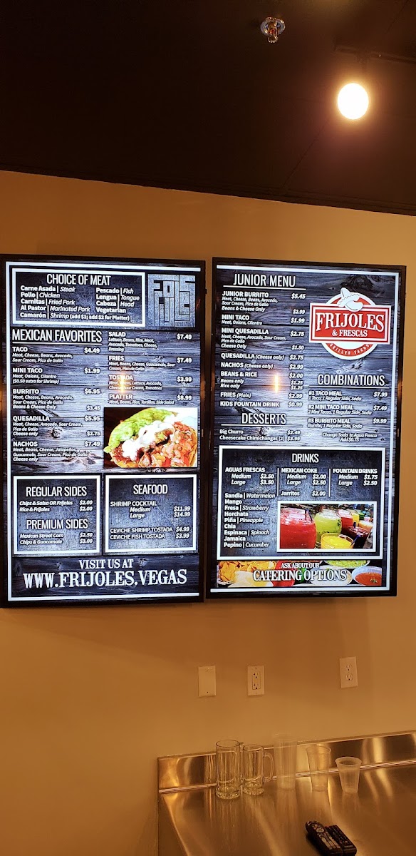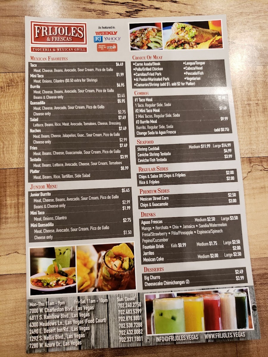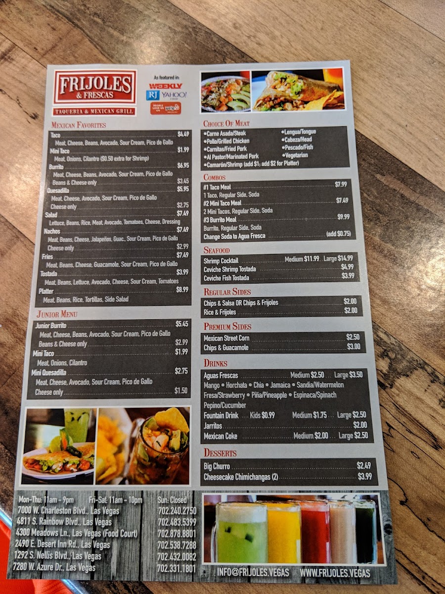 The menu at Frijoles & Frescas Grilled Tacos presents a variety of Mexican dishes and beverages suitable for casual dining or catering needs. It includes a range of tacos, burritos, and traditional Mexican appetizers and sides, accommodating both meat and vegetarian preferences.